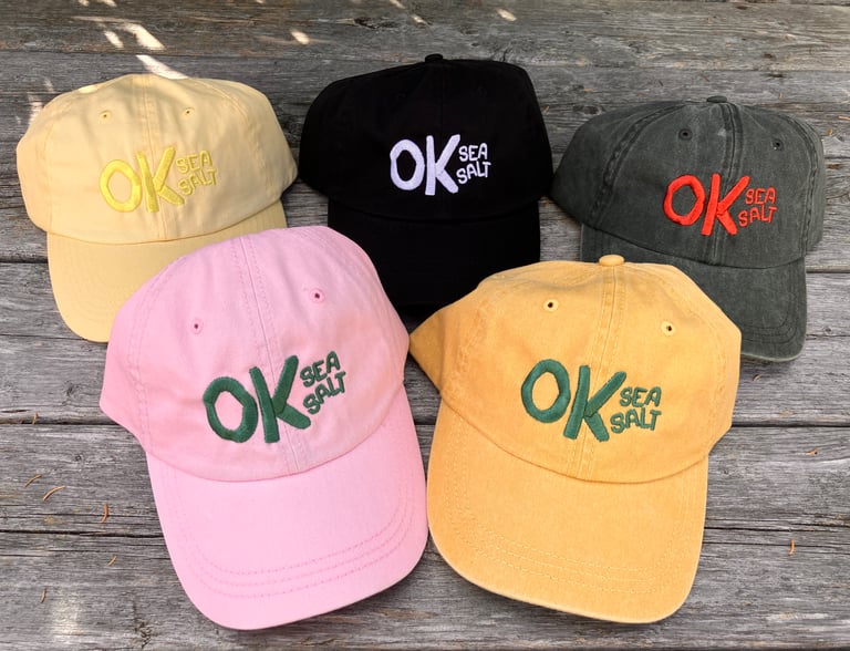 This wildly popular "dad-style" hat has "OK Sea Salt" embroidered on the front and "LaHave Islands, NS" on the back. South Shore high fashion.